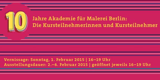 10 Jahre Akademie für Malerei BerlinAusstellungsdauer: 2. bis 6. Februar 2015 | geöffnet 16 bis 19 Uhr Akademie für Malerei Berlin | Hardenbergstraße 9 | 10623 BerlinEs stellen aus: Hiltrud Arens | Karin Barsch | Christa Bietz | Mareike Biggam | Sabine Biller | Christiane Böning | Ulrike Bretschneider | Johanna Brosien | Silke Büchner | Christiane Cicéron | Bettina Eisenhuth | Alex Evang | Christine Geißler | Angelika Hagen | Antje Hampe | Joachim Henkel | Marianne Hönemann-Draeger | Sybilla Keitel | Sybille Koenig | Ramona Kreft | Iris Kremer | Horst Kröniger | Heidrun Kunert | Andreas Langer | Monika Leipold | Thomas de Leliwa | Margit Lohr | Christine Lübge | Carola Malter | Johanna Manolopoulos | Dorothea Menne | Ulrike Neubauer | Jorinde Nisse | Martin Paul | Angelika Petry-Geurtsen | Manfred Poppe | Bernhard Röhrich | Sonja Sager | Monika Schmidt | Verena Sommerfeld | Alisha Steinberger | Sigrid Steiß | Anabela Switha | Gisela Timper | Annette Trotz | Iris Ulbricht | Irmgard Voelz | Christiane Vogt | Konstanze von Ascheraden | Michael Wahl | Pia Wenzel | Gabriele Willing | Manuela Wutschke