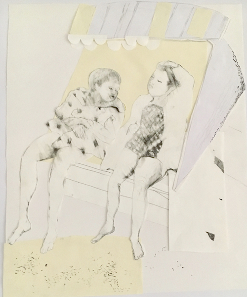 o.T. 2016. Grafitstift, Radierer, Collage auf verschiedenen Papieren, 46 x 39 cm