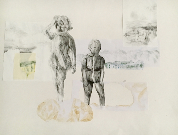 o.T. 2016. Grafitstift, Farbstifte, Radierer, Collage auf Papier, 50 x 70 cm